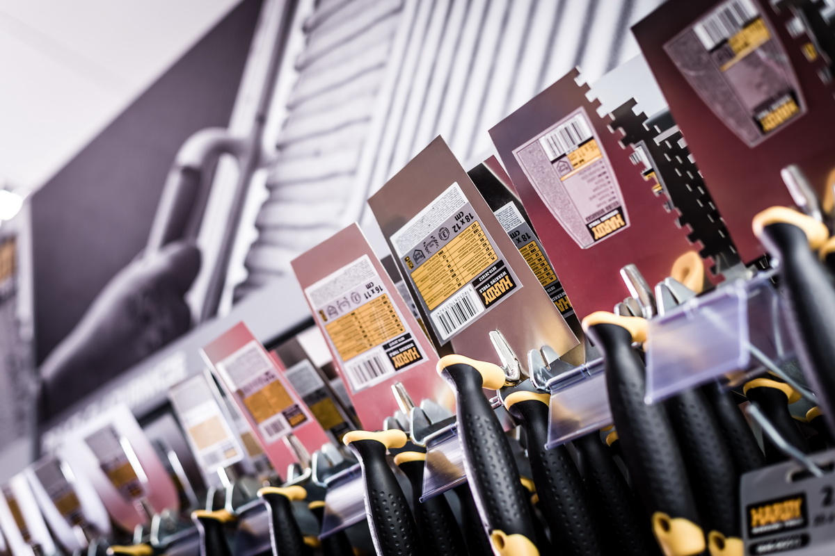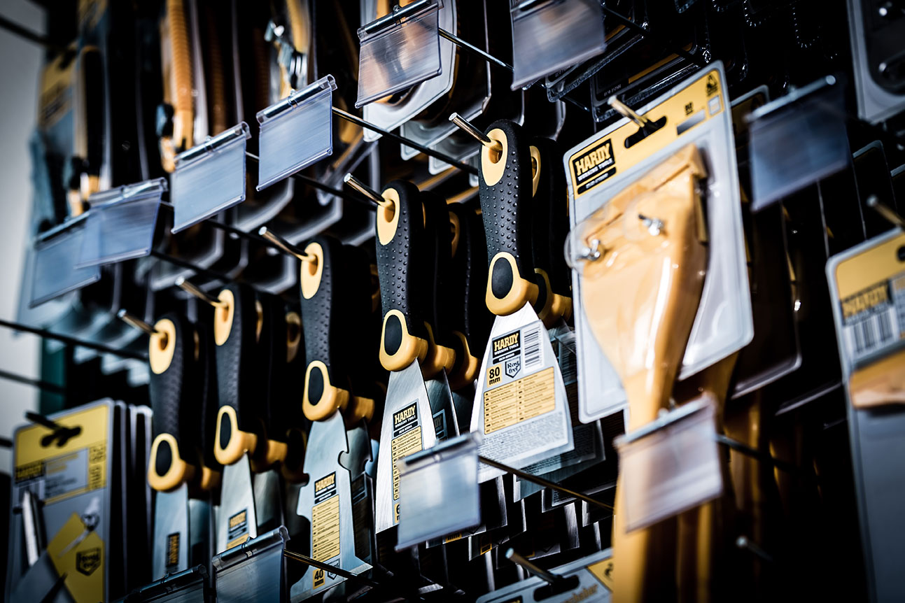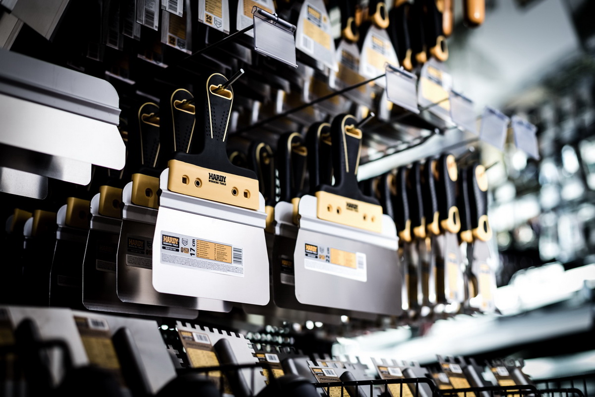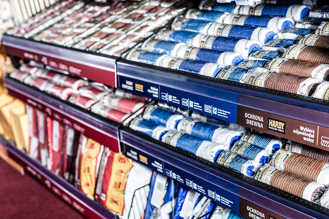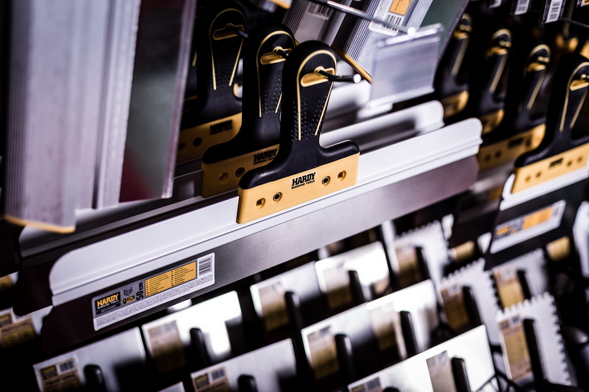 Благодарение на оптимизираното позициониране на продуктите, графичния дизайн и цветовата схема, стелажите улесняват избора на подходящи работни инструменти от клиента. Цветовата схема, използвана при подреждане на стоките върху стелажите ни, е допълнена с цветови индекс на етикета на всеки продукт.